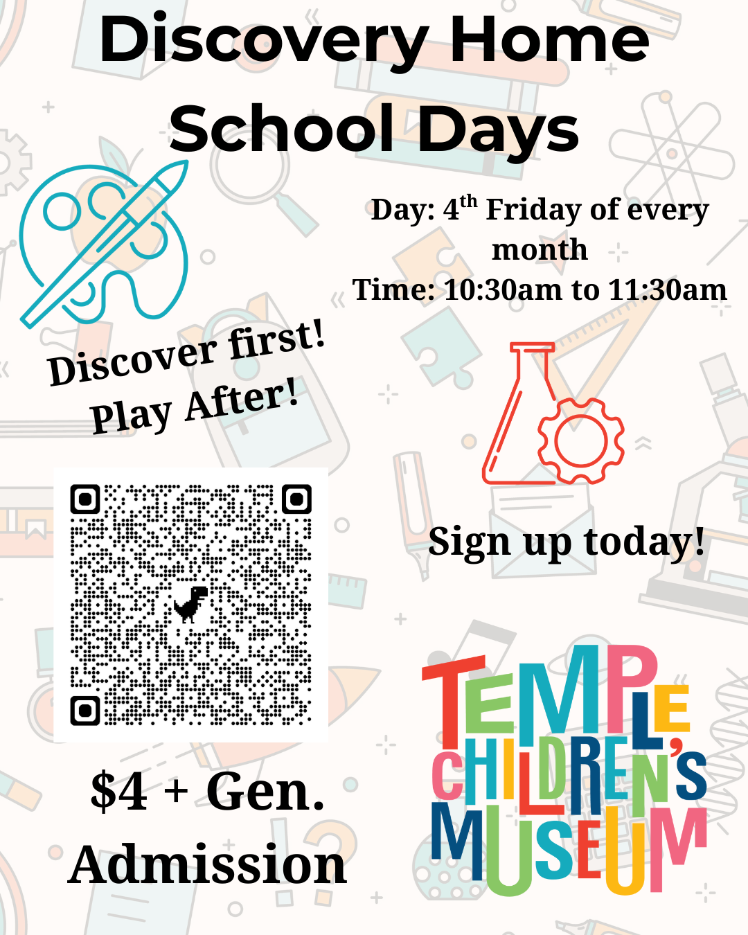 Welcome to Discovery Home School Days! A variety of STEAM-centered (Science, Technology, Engineering, Arts, and Math) hands-on activities are available for children to explore, thoughtfully designed to support growing bodies and minds through movement, making, and critical thinking. Families are encouraged to stay and play once the program has finished; adult tickets are for general museum admission only.