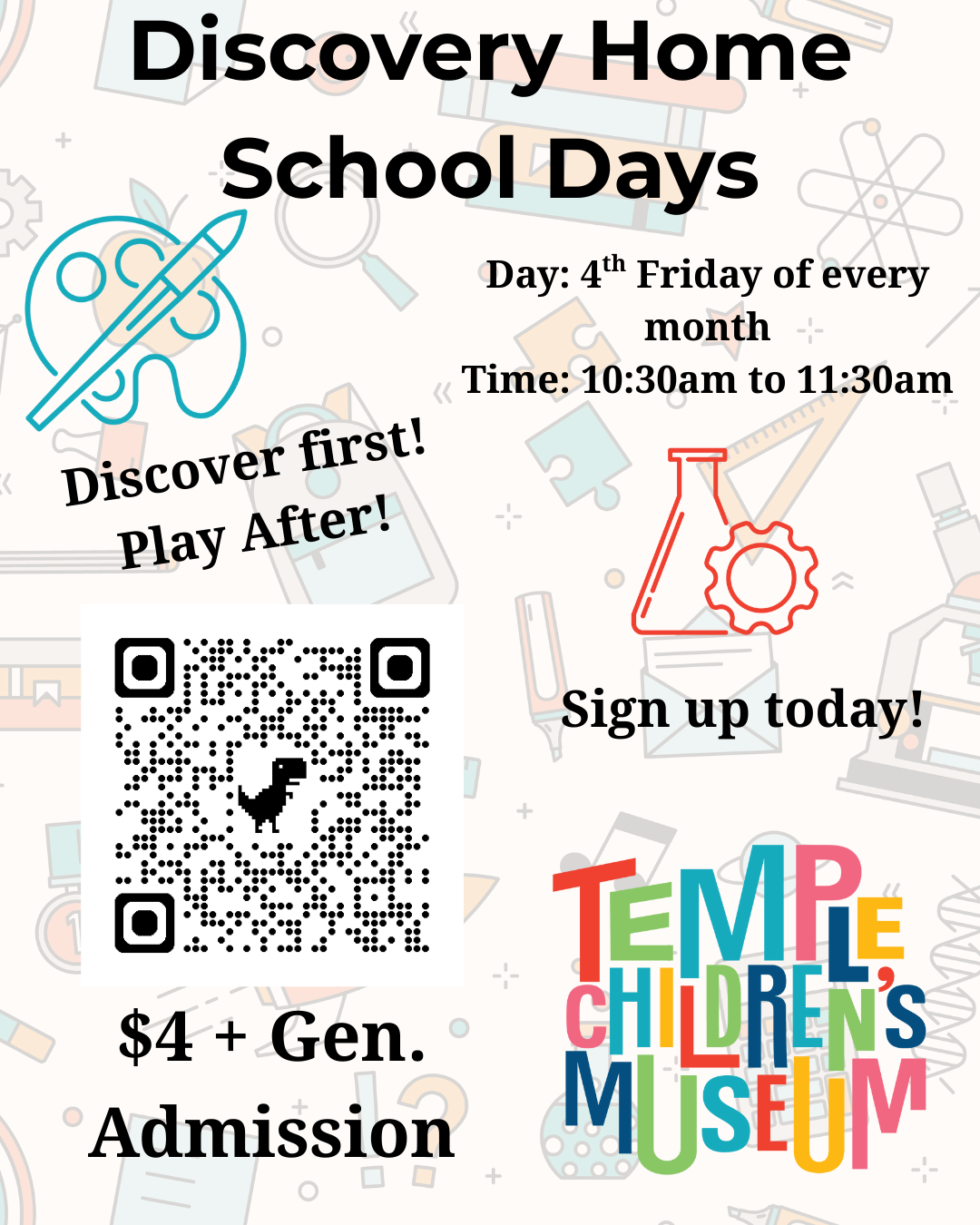 Welcome to Discovery Home School Days! A variety of STEAM-centered (Science, Technology, Engineering, Arts, and Math) hands-on activities are available for children to explore, thoughtfully designed to support growing bodies and minds through movement, making, and critical thinking. Families are encouraged to stay and play once the program has finished; adult tickets are for general museum admission only.