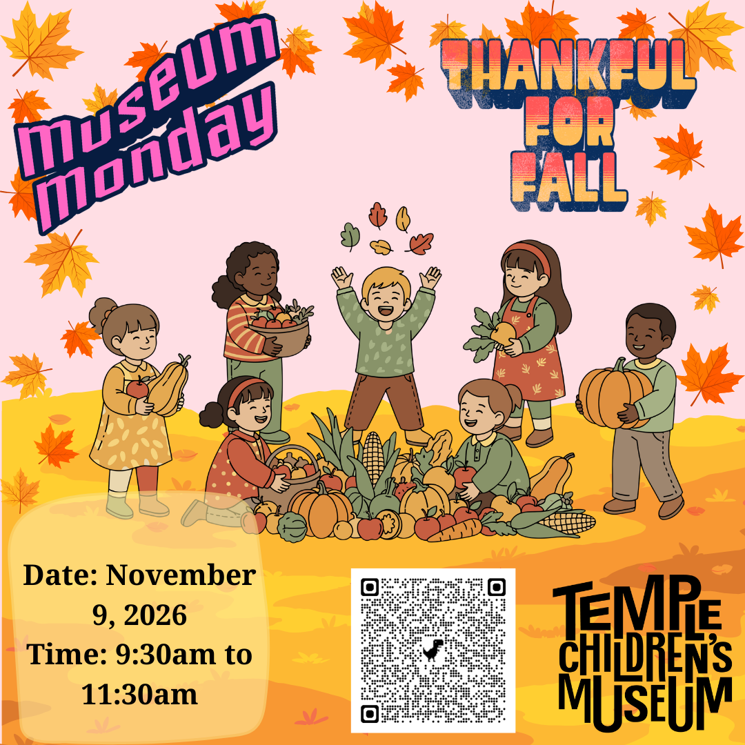 Celebrate the season at November’s Museum Monday with hands-on STEAM activities inspired by fall and the harvest! Young learners will explore nature, patterns, and creativity through playful projects that highlight the colors, textures, and traditions of autumn. From building and experimenting to creating seasonal art, children will discover the science and wonder behind this bountiful time of year.