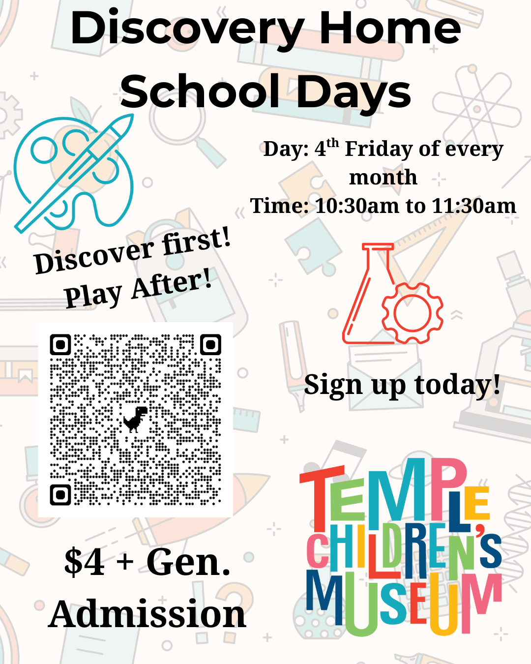 Welcome to Discovery Home School Days! A variety of STEAM-centered (Science, Technology, Engineering, Arts, and Math) hands-on activities are available for children to explore, thoughtfully designed to support growing bodies and minds through movement, making, and critical thinking. Families are encouraged to stay and play once the program has finished; adult tickets are for general museum admission only.